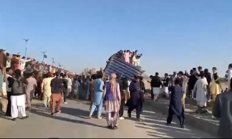 Another video shared with Dawn showed dozens gathered at an unknown location, with people pushing aside containers that had been placed to block a route.