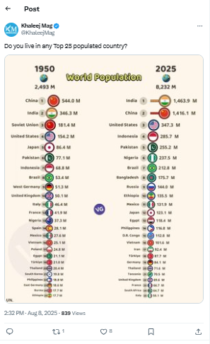 According to the Khaleej Mag, this rapid growth has propelled Pakistan from the 6th most populous nation in 1950 to 5th place globally in 2025, overtaking countries such as Brazil and Nigeria.