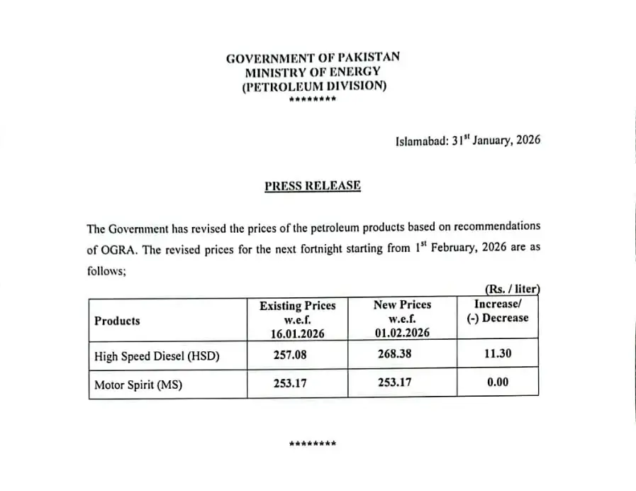 The federal government has increased the price of high-speed diesel by Rs11.30 per litre, while keeping petrol prices unchanged for the next 15 days. The new prices will take effect from February 1.