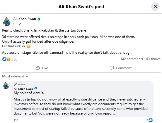 Ali Khan Swati, who leads Layesha and Red Tale Studio and trains at the National Incubation Center, shared on Facebook how his experience revealed a harsh reality. Although his startup secured funding just 20 days after the episode aired, the investment came from other investors whose terms aligned better with his vision. Notably, the “Shark Tank” team never included him in their official due diligence process.