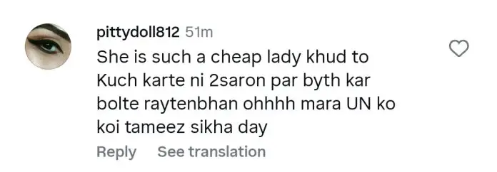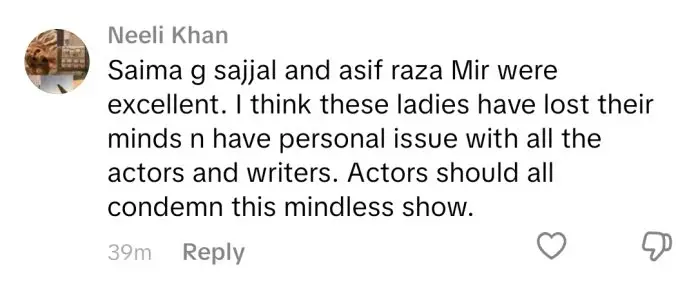 Fans didn’t hold back in the comments section after Nadia Khan’s mockery. One fan wrote, “Saima G carries her class. Who are you to criticize her? I haven’t seen you in any memorable role. She’s a legend.”