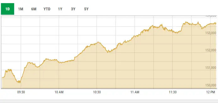 The index gained 3,619.38 points, or 2.41 per cent, to stand at 153,635.54 points at 12:06pm from the previous close of 150,016.16 points.