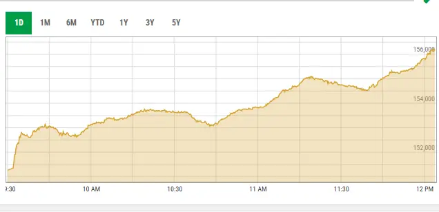 The KSE-100 index climbed by 7,461.58 points, or 5.02 per cent, to stand at 156,204.89 from the previous close of 148,743.31.